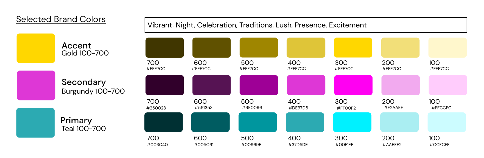 Accent: Gold being luxurious and reserved for special moments, gold is a precious colour, communicating generosity and compassion, as well as being synonymous with divinity and power in many religious and celebratory settings. As gifts are given in either religious, traditional, or celebratory occasions, it is the perfect accent colour. Used for linework.